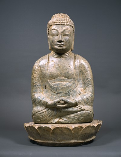 奈良博が見どころのコレクションとして推奨するのが重要文化財の《弥勒如来坐像》長崎県鉢形嶺経塚出土(平安時代 延久3年・1071年、後期展示)。石の塊から彫り出した如来像。内部に経巻を納めるため、像底に大きな孔が開く。胸や背面に願主や仏師の名前を刻んでいた。