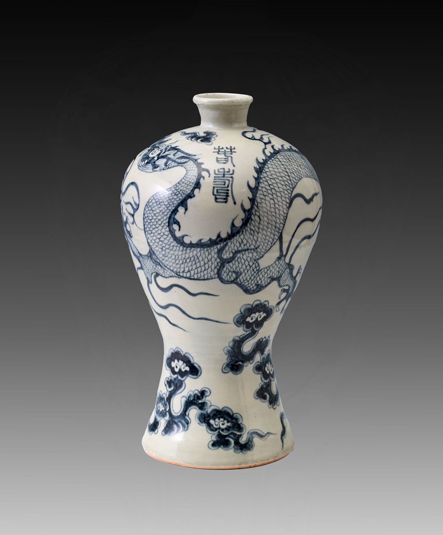 《青花雲龍文梅瓶(せいかうんりゅうもんめいぴん、「春壽(しゅんじゅ)」銘》(明時代・洪武 1368-1398年/景徳鎮窯、上海博物館)は、胴には五爪の龍と霊芝雲(れいしうん)が良質のコバルト顔料で描かれ、龍の上方には、篆書(てんしょ)体の「春壽(寿)」銘が見られる。五爪の龍は元時代以降、皇帝の象徴となり、明時代・洪武朝の宮廷用磁器である。